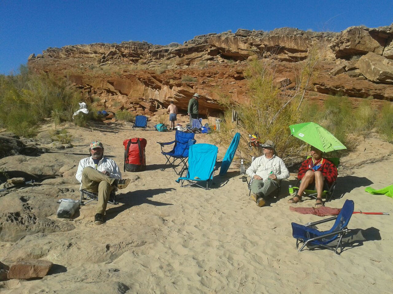 Day 1 campsite at river mile 23. Guys enjoy a well-earned river-cooled beverage.