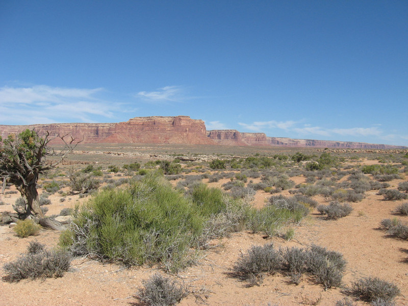 I believe that the high ground in the distance is Cedar Mesa. This is an area rich in prehistoric Native American cliff dwellings and petroglyphs.