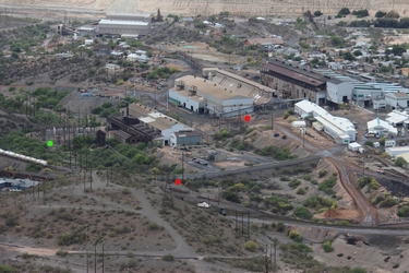 The red dots in the photo mark the SCIP towers that run to a substation down at the ASARCO plant. The green dot marks a tower that is identical to the two inactive towers seen on the skyline. The building centered within the dots is the old power plant that not only provided electricity for the reduction operations at the mill and smelter, but supplied electricity to the towns of Hayden and Winkelman, the mine at Ray, and also the electrical power for the Christmas mine. That power plant went online sometime around 1911.