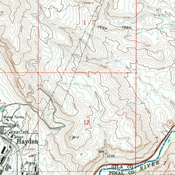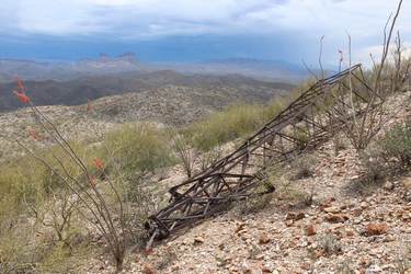 This adventure came about after I had read a 1916 newspaper article and a 1919 mining engineer's report that described an electrical power line on steel towers that had run between a power plant in Hayden Arizona and the mine camp at Christmas several miles to the north. I had grown up in the Hayden area in the 1960's and had never heard about this old line. I wondered whether there could be any remnants of it still in existence today and I decided to go investigate.