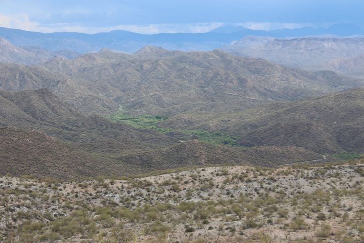 View out to the northeast from the skyline above Hayden. The green growth in the center of the photo is the Gila River