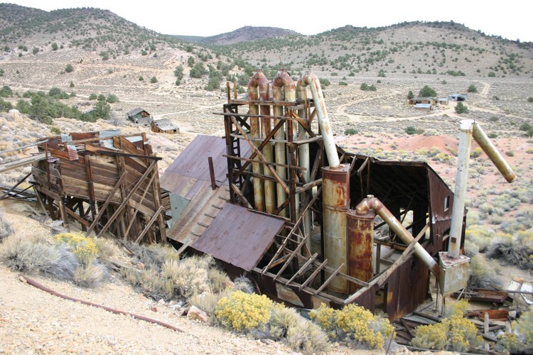 The characteristic condenser tubes of a mercury mill. Notice the clusters of houses in the distance
